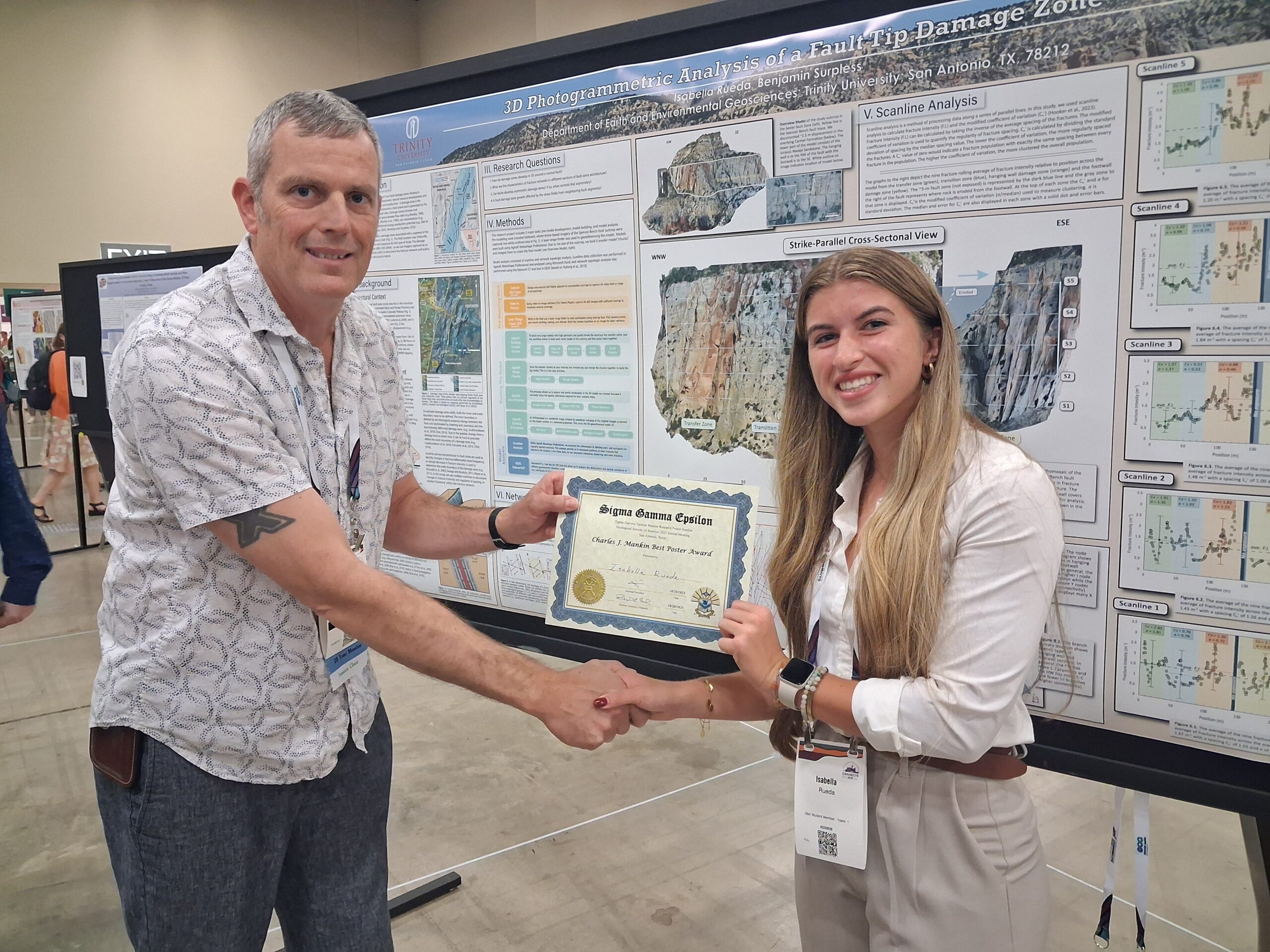 The 2025 Austin A. Sartin Award was awarded to Isabella Rueda, a member of Delta Xi Chapter at Trinity University in San Antonio, Texas. Isabella was the presenting co-author on a poster that reported on the use of unmanned aerial vehicles (UAV) and photogrammetric techniques to quantitatively assess the damage zones surrounding the tip of fault planes.